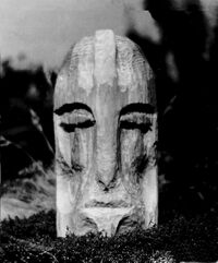 Portraits der 12 Urvölker als stilisierte Holzmasken: