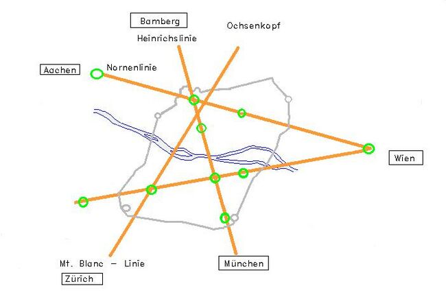 Der feinstoffliche Kräftefluss ist wesentlich durch die vier Leylinien geprägt, die Nürnberg durchziehen und beleben. Im Bild unten ist ihr Verlauf schematisch dargestellt. Fast alle Kirchengründungen bis 1450 liegen auf einer dieser Linien oder sogar auf Kreuzungen. Dieses Muster sorgte dafür, dass Nürnberg bis heute in seiner Kraft bleiben konnte.